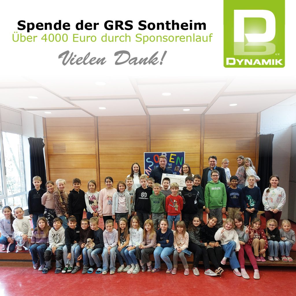 Vielen Dank für die fantastische Spende von über 4.000 Euro! Der Erlös des diesjährigen Sponsorenlaufs der GRS Sontheim kam dem Dynamik e.V. Kinder- und Jugendhilfe zugute. Ein herzliches Dankeschön an alle Schülerinnen und Schüler für ihre gelaufenen Runden, an alle Sponsoren für die großzügige Unterstützung, an die Lehrerinnen und Lehrer der GRS Sontheim für die hervorragende Organisation der Veranstaltung und an die Drittklässler für die herzliche Übergabe der Spende.